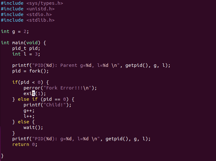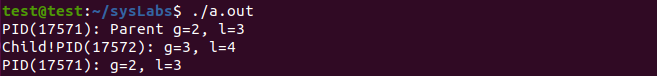 global 변수의 g=2가 있고, 지역변수 l=3 이 있다. 여기서 fork 를 해서 자식 pid 17572가 생겼고, g++, l++이 각각 실행되어 3,4 가 출력되었다. 그리고 마지막 pid 의 g, l 값을 보면 자식 프로세스와 별개라는 것을 알수 있다.