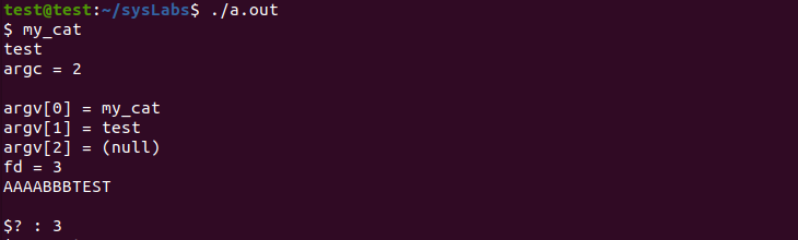 execl 의 첫번째 cmd 가 실행 binary 인 my_cat 을 입력한것이고, 두번째 cmd 에는 cat 할 파일의 이름을 입력한다. 그럼 이 2개의 cmd 매개변수가 전달되어 " ./my_cat test " 라는 bash 를 실행하게 되는것이다. 그리고 my_cat.c 에서 return 3을 해주도록 되어있는데,