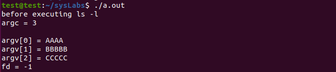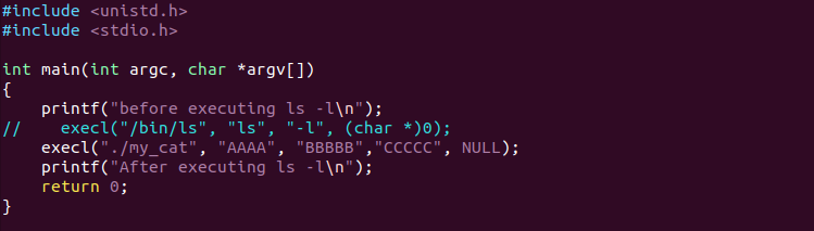 ./my_cat 을 실행하는데, my_cat 이 매개변수 argv 3개를 입력& 출력 하도록 되어잇다. execl 을 통해 AAAA, BBB, CCC 를 넘겨주면 ./my_cat 을 실행함과 3개의 매개변수를 넘겨준다.
