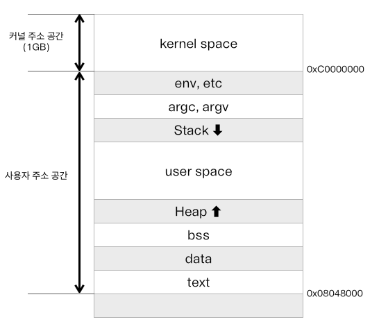 Linux 는 이 중에서 0GB ~ 3GB의 공간을 사용자 공간으로 사용하고, 나머지 3GB ~ 4GB를 커널 공간으로 사용한다.