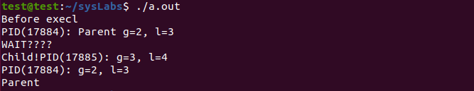 execl() 을 호출하여 앞에서 만든 fork 바이너리 파일을 실행한다. 그 결과 앞에서 출력되었던 결과내용이 출력된다.