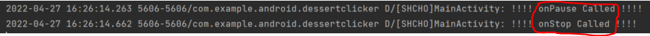 공유 버튼을 누르면 , onPause 로그만 출력이 되고, 다시 앱 화면을 눌러 화면으로 돌아가면 onResume 로그가 뜬다.