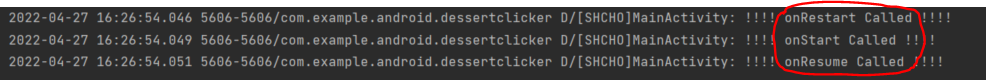 이전 단계에서 Activity가 소멸되었으므로, (onDestroy) 앱으로 돌아가면 안드로이드는 새 활동을 시작하고, onCreate, onStart, onResume을 호출한다. 이전 활동의 로그가 유지되지 않은것이다.