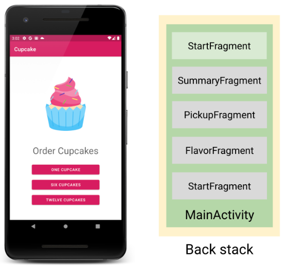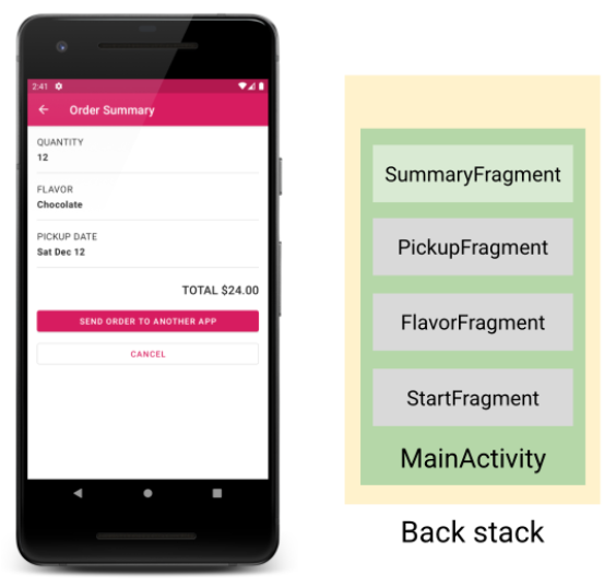 위와 같이 StartFragment 에서 시작해서, 주문 App의 마지막 화면인 SummaryFragment까지 갔다가, CANCLE 버튼을 눌러 첫화면으로 돌아갔다면,